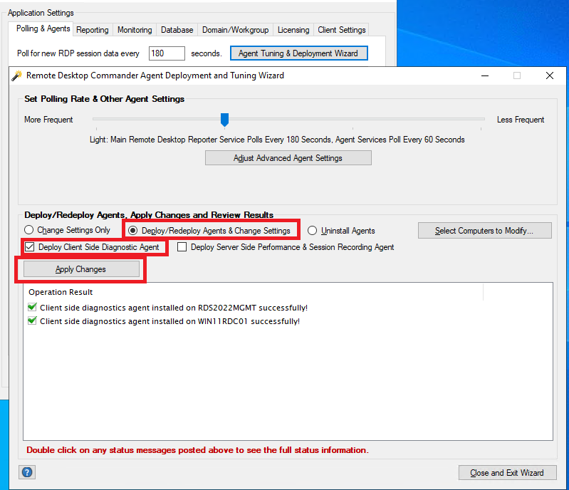 To push out the new Remote Desktop Commander Client Side Diagnostics Agent, raise the Agent Deployment Wizard, chose “Deploy/Redeploy Agents & Change Settings,” and check the “Deploy Client-Side Diagnostic Agent” option – you can also choose to update or deploy the Server Side Performance and Session Recording Agent if you wish. Then click “Apply Changes.” In a moment, you should see the wizard come back with the status of the deployment to all of your session hosts. Note that this does not require a restart of your session hosts, the components immediately become active when a user logs back in or reconnects to their session on the host.